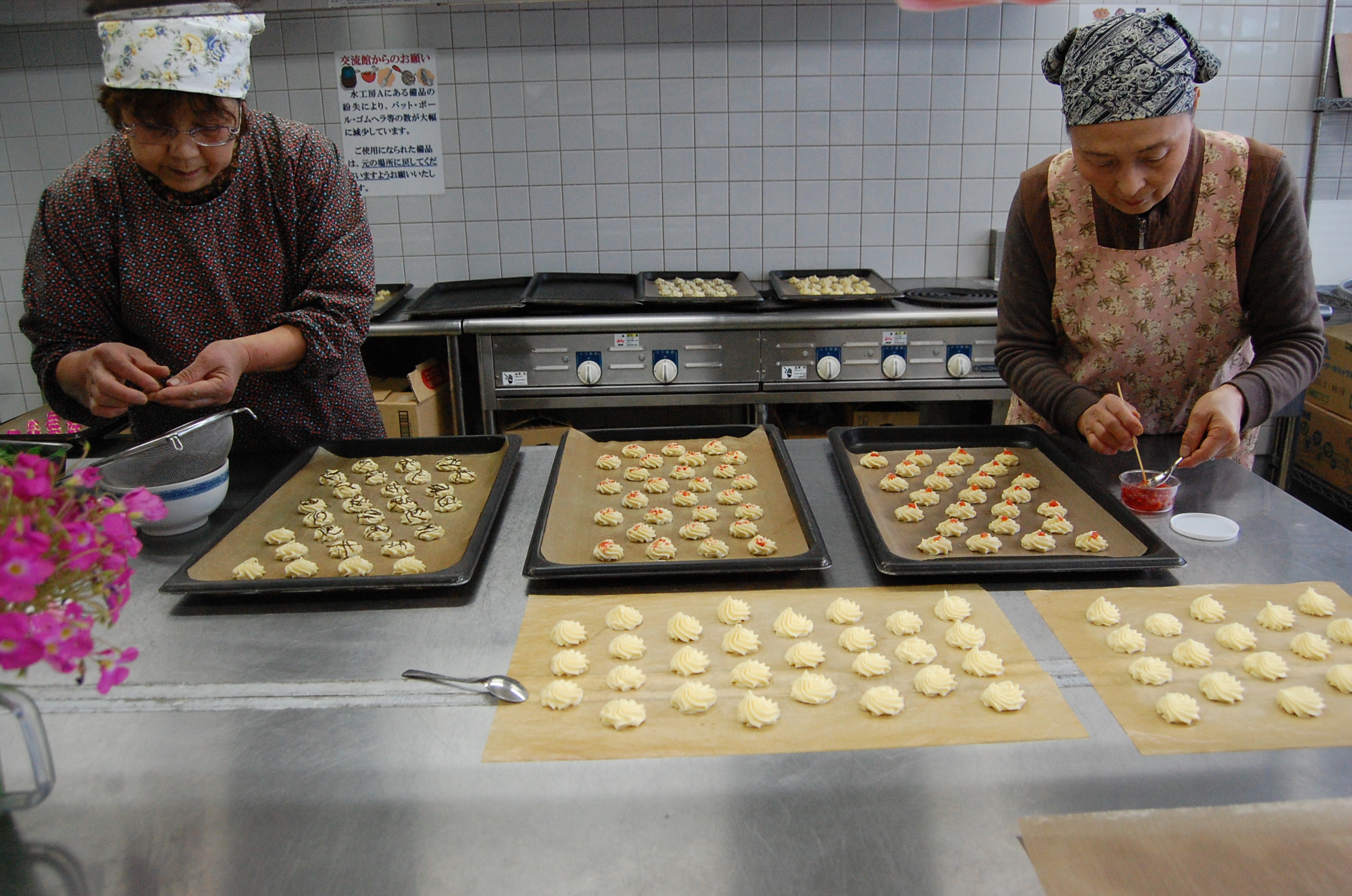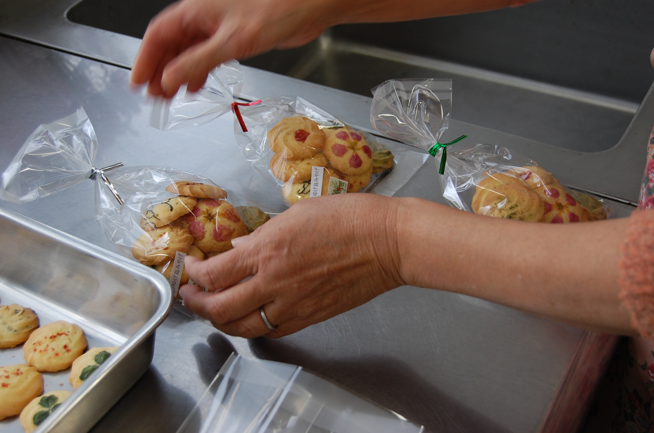 4人の女性たちの手で、野草のクッキーは焼き続けられています。
