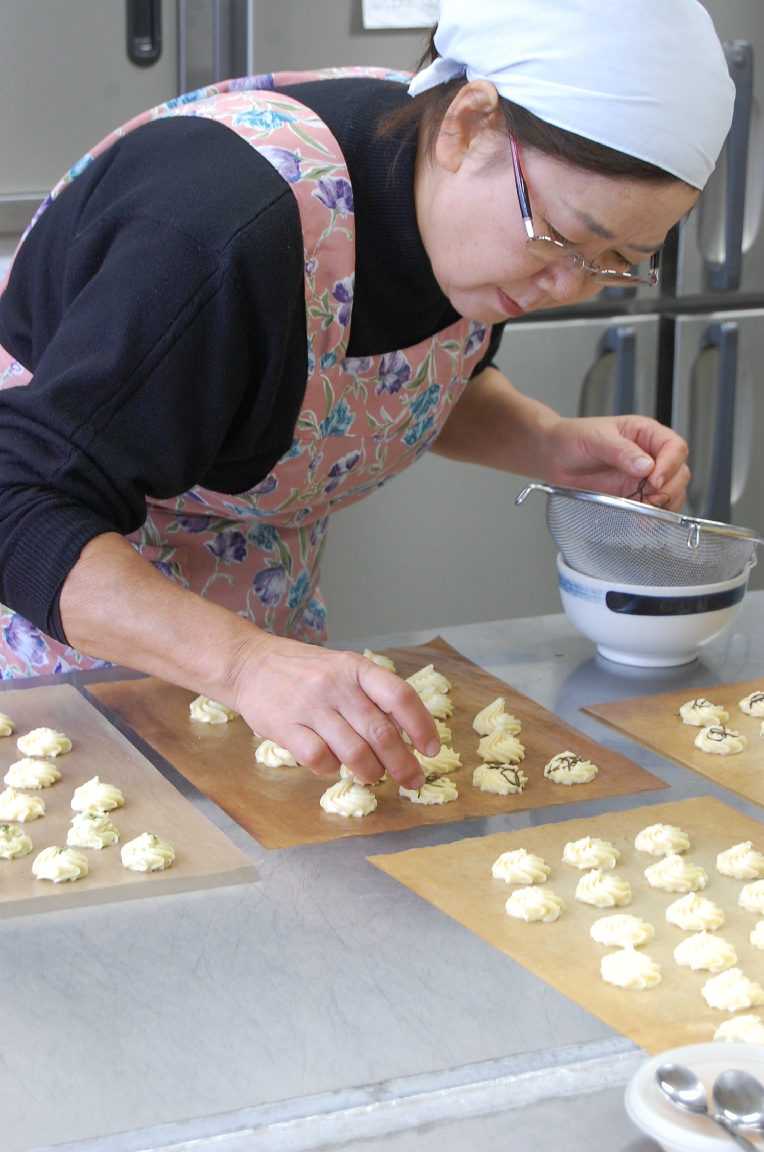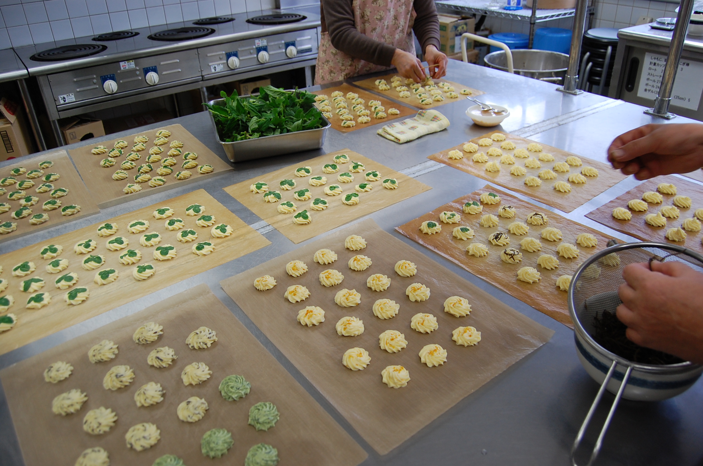 摘み菜クッキーの生地は、ひとつひとつ手で絞り出して作られていきます。